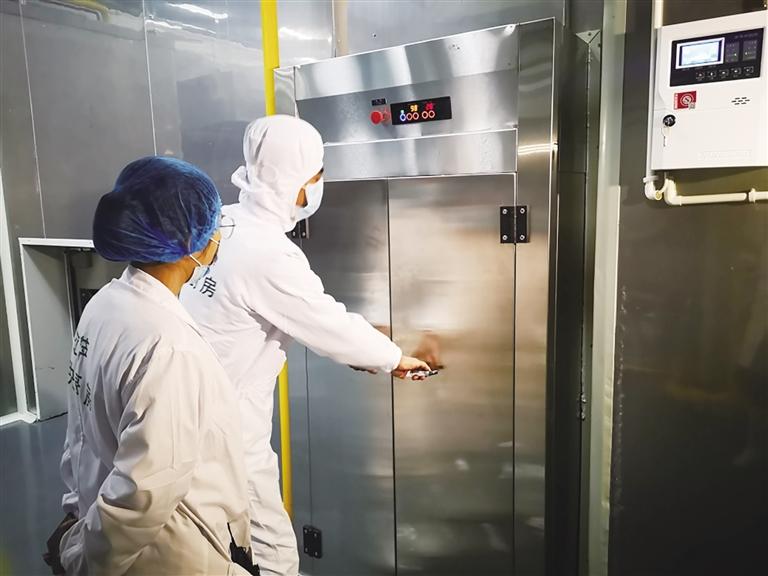 通過(guò)員工通道,在該廚房生產(chǎn)廠長(zhǎng)甘文忠的指導(dǎo)下,記者穿上了白色工作服、戴上食品安全帽,換上高筒膠鞋,洗手消毒、測(cè)量體溫、隨身攜帶的手機(jī)、首飾全部摘掉后,通過(guò)腳踏池進(jìn)入生產(chǎn)加工車間。