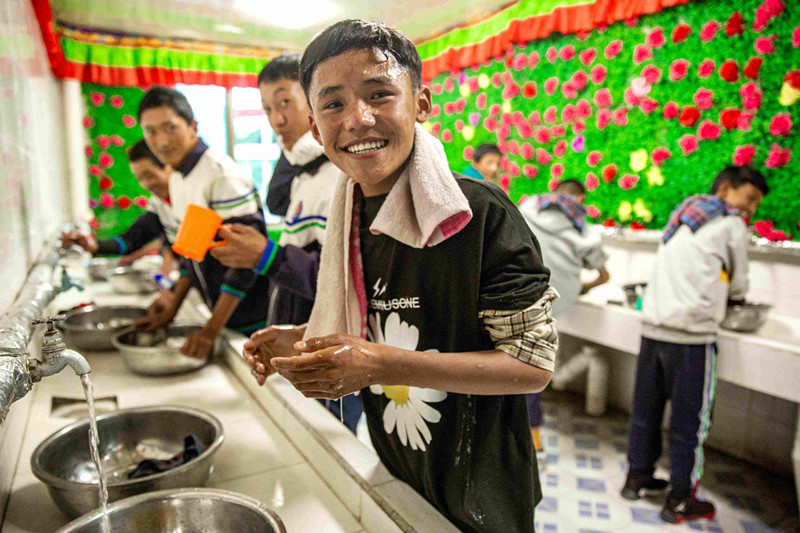 走進(jìn)薩迦中學(xué)新投入使用的女生宿舍樓,可以看到每個(gè)房間門口都布置了信息欄,詳細(xì)介紹了入住學(xué)生信息、室長(zhǎng)和帶教老師信息;門口統(tǒng)一配備鞋架,孩子們?cè)陂T口換好鞋再進(jìn)房間,保持了室內(nèi)地面的清潔。室內(nèi)外隔間是統(tǒng)一的儲(chǔ)物柜,存放學(xué)生私人用品;內(nèi)間是整整齊齊8個(gè)上下鋪位,中間合用的臺(tái)子上牙刷、水杯整齊劃一擺放;靠窗有統(tǒng)一的臉盆架;每個(gè)樓層都有3處盥洗室。由于縣中學(xué)內(nèi)沒(méi)有學(xué)生浴室,新宿舍盥洗室內(nèi)還特地安裝了電加熱的恒溫暖水設(shè)備。入冬后,薩迦中學(xué)的孩子們終于能夠在宿舍洗漱時(shí)用上熱水了。