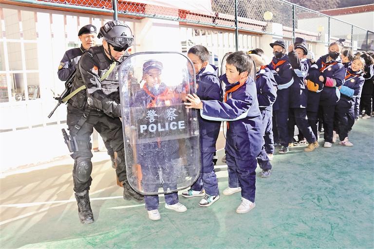 圖為比如縣公安局民警正在為比如縣第三小學(xué)五年級(jí)的學(xué)生講解警用盾牌的使用方法。記者 萬(wàn)靖 攝