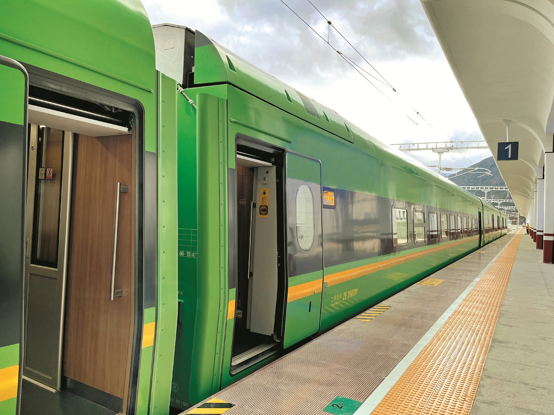 拉林鐵路是我國首列雪域高原電氣化鐵路,開通了拉薩至林芝九個中間客貨辦理站點(diǎn),包括拉薩、貢嘎、山南(桑日)、加查、朗縣、米林、林芝等。列車穿行在岡底斯山和喜馬拉雅山中的藏南谷地,途經(jīng)三個市七個縣(區(qū)),全長435.48公里,設(shè)計(jì)時速160公里,設(shè)定商務(wù)座、一等座、二等座三個等次,中間編掛拖車,編組為12輛,定員755人。
