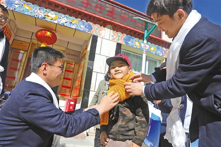 圖為建行職工在給小朋友佩戴愛(ài)心圍巾。記者 格桑倫珠 攝