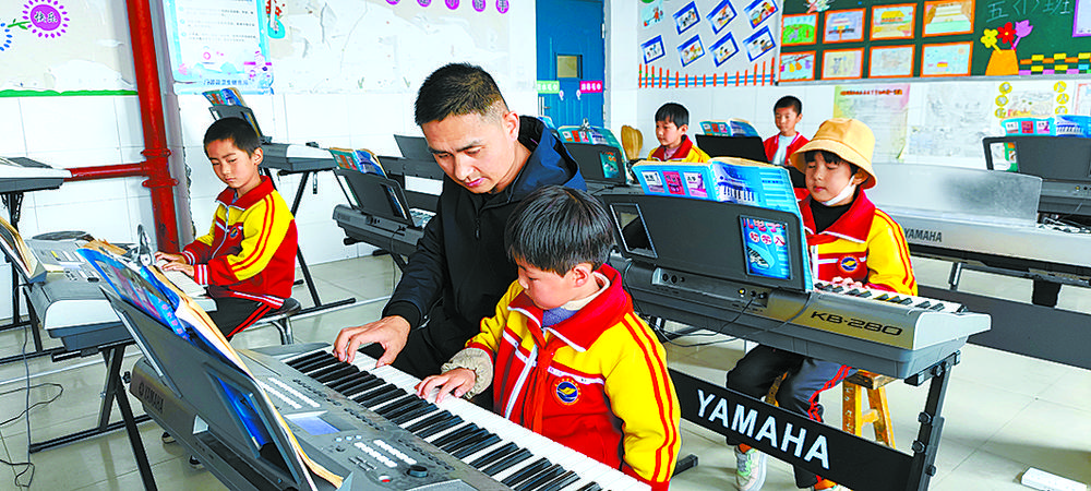 “我會教他們認(rèn)樂譜、怎么卡節(jié)奏、唱什么聲部,經(jīng)過長期堅持學(xué)習(xí),孩子們進步很快?!敝艿猛呏笇?dǎo)學(xué)生彈奏電子琴的指法,邊笑著和我們聊到,自從2017年,學(xué)校配備了專門的音樂教室,每堂課他都會堅持使用樂器,以此來培養(yǎng)孩子們的音樂素養(yǎng),效果非常不錯。