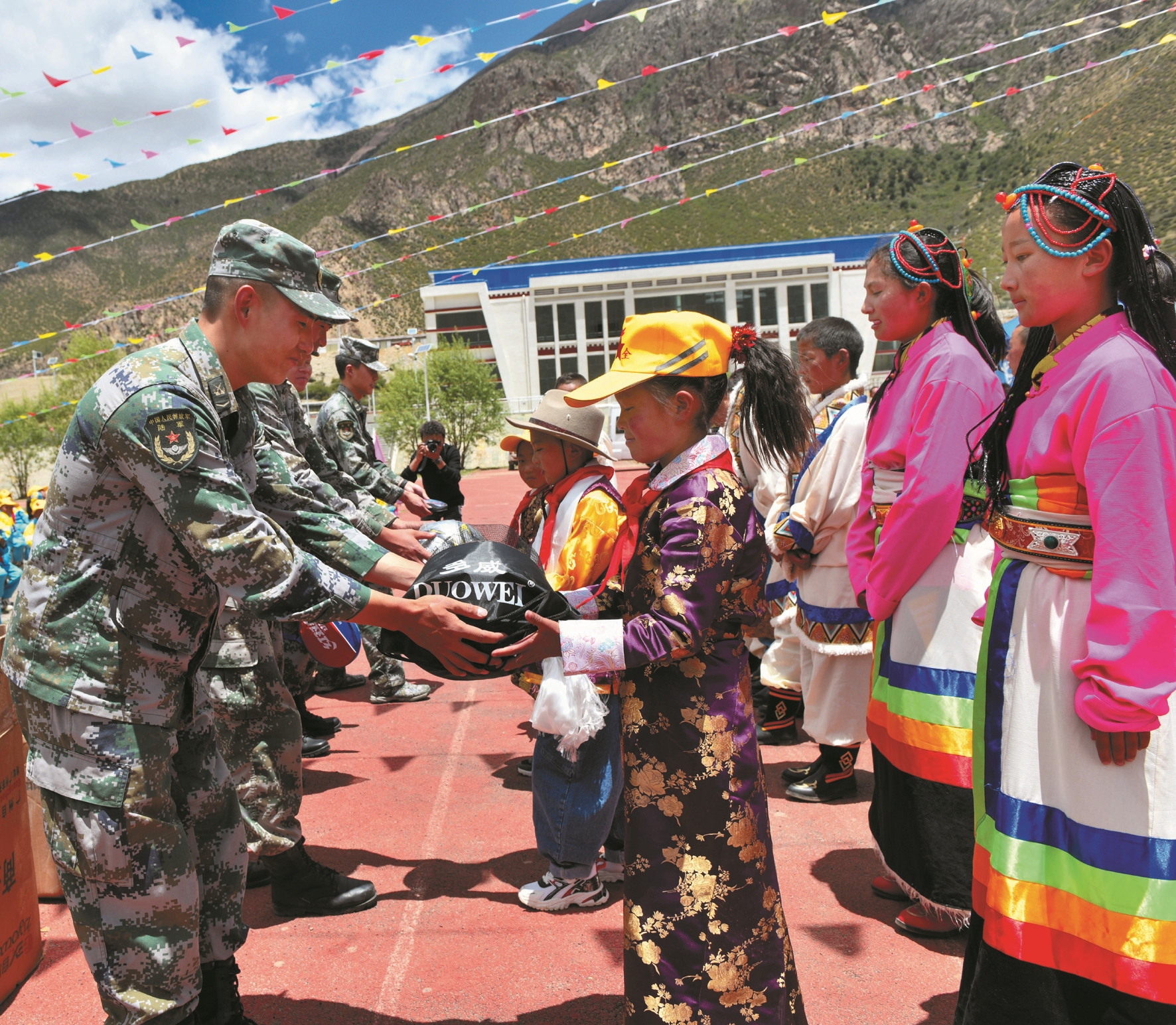 圖為活動(dòng)現(xiàn)場,西藏軍區(qū)某部戰(zhàn)士向阿朗鄉(xiāng)中心小學(xué)學(xué)生捐贈(zèng)愛心物品。(市委宣傳部駐拉康村工作隊(duì)供圖)