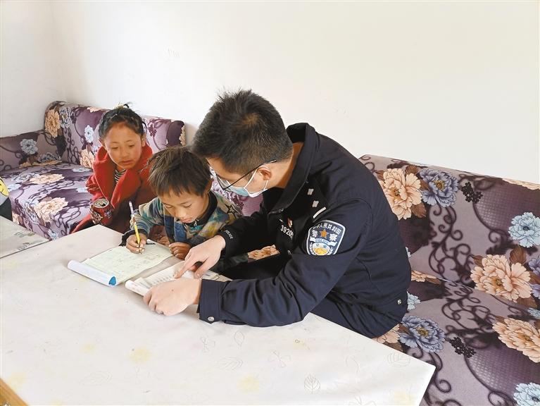 “老師,小扎西最近在學(xué)校表現(xiàn)的怎么樣?”扎西江措在上察隅鎮(zhèn)小學(xué)上一年級(jí),這個(gè)年齡段的孩子,最是調(diào)皮的時(shí)候,每當(dāng)派出所民警下鄉(xiāng)走訪經(jīng)過學(xué)校時(shí),都會(huì)找到小扎西的班主任詢問最近狀況。孩子們?nèi)粘W(xué)習(xí)、生活中的一舉一動(dòng),不僅牽動(dòng)著派出所民警的心,也牽動(dòng)著遠(yuǎn)在千里之外駐村民警化旦的心。“柯琪,孩子們最近還好嗎?我看物流信息顯示圖書和零食已經(jīng)到了,你們下鄉(xiāng)的時(shí)候就把東西帶過去……”2020年,化旦分配到上察隅邊境派出所,喜歡孩子的他,迅速和扎西、拉姆打成一片,平時(shí)只要有空便帶著學(xué)習(xí)、生活用品去看他們,為了迎合孩子們的興趣愛好,化旦也會(huì)從網(wǎng)上學(xué)習(xí)兒童歌曲、舞蹈,與孩子們一起唱歌跳舞。