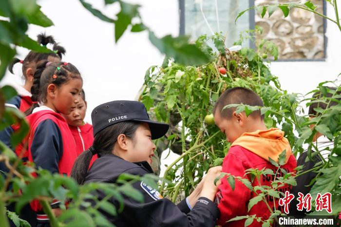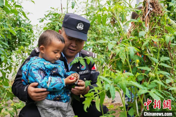 圖為亞東出入境邊防檢查站民警與龐達(dá)村雙語幼兒園小朋友共同采摘成熟了的西紅柿?!±铄\輝 攝