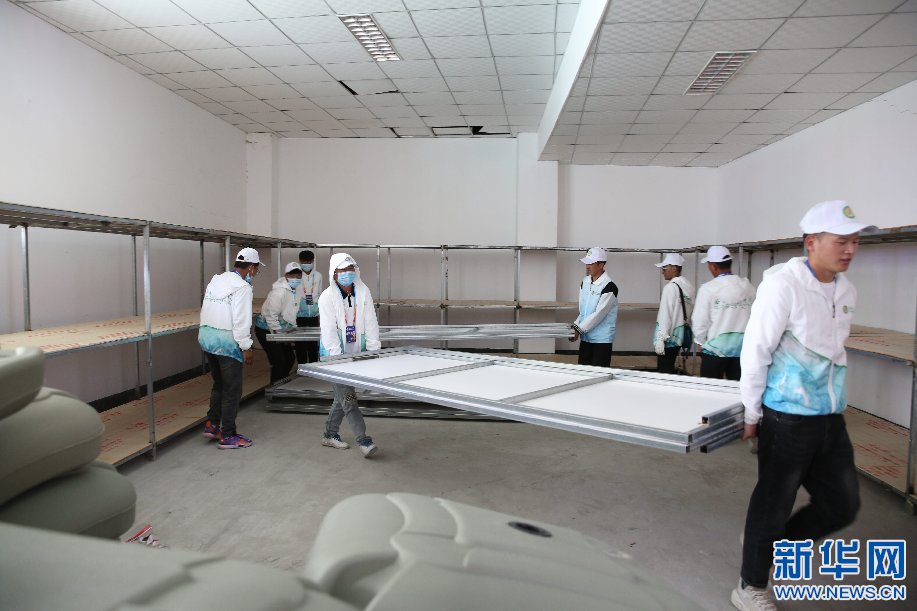 志愿者正在布置運(yùn)動(dòng)會(huì)場地。(劉勇 攝)