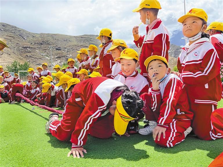 曲水縣達(dá)嘎鎮(zhèn)小學(xué)學(xué)生在體驗(yàn)民族傳統(tǒng)體育項(xiàng)目押加。(圖片由區(qū)社體中心提供)
