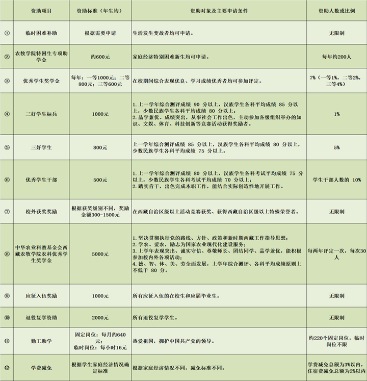 這些資助項目包括國家政策、西藏自治區(qū)政策和西藏各高校的政策,全部列出了明確的申請條件,涵蓋了學(xué)生生活、學(xué)習(xí)的方方面面。其中,有的項目針對家庭經(jīng)濟(jì)困難的學(xué)生給予學(xué)費(fèi)、住宿費(fèi)等的減免;有的項目為學(xué)生提供各種校內(nèi)勤工助學(xué)機(jī)會,讓學(xué)生通過勞動獲得報酬;有的項目獎勵入伍,有的項目獎勵發(fā)明創(chuàng)造……并且,西藏各高校在制定資助政策時體現(xiàn)出了各學(xué)校鮮明的辦學(xué)特點。例如,西藏藏醫(yī)藥大學(xué)設(shè)置了面向所有學(xué)生的“記誦《三部醫(yī)典》獎”,要求“熱愛社會主義祖國,擁護(hù)中國共產(chǎn)黨的領(lǐng)導(dǎo);遵紀(jì)守法,遵守學(xué)校規(guī)章制度;背誦學(xué)生按‘三部醫(yī)典’章節(jié)順序依次背誦。在背誦過程中,要吐字清晰,聲音宏亮,總時間不能超過2個小時?!狈彩沁_(dá)到要求的學(xué)生,獎勵1800元。