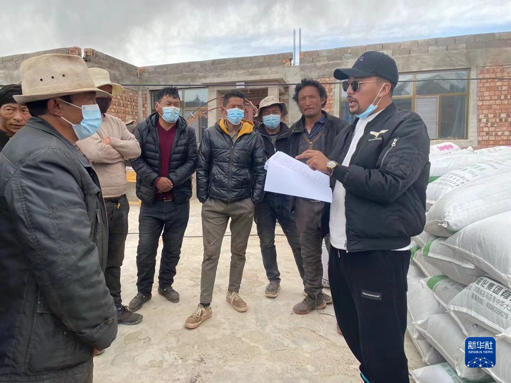 2021年4月13日,拉東才索南(右一)正給農(nóng)民發(fā)放黑青稞種子。(受訪者供圖)