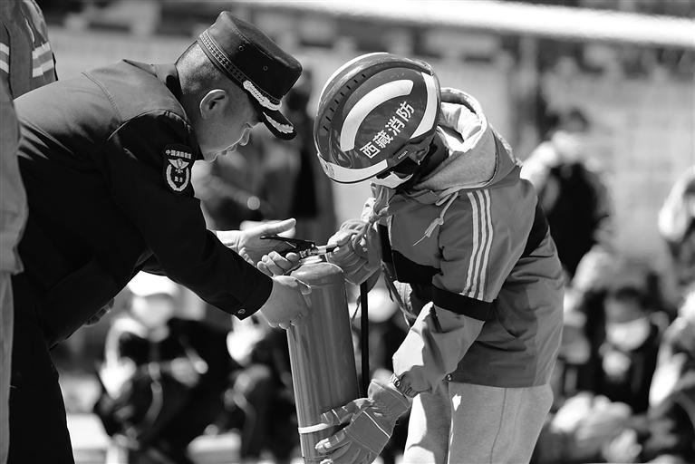 圖為消防知識(shí)進(jìn)校園活動(dòng)中,消防員手把手教學(xué)生學(xué)習(xí)使用滅火器。(圖片由山南市消防救援支隊(duì)提供)