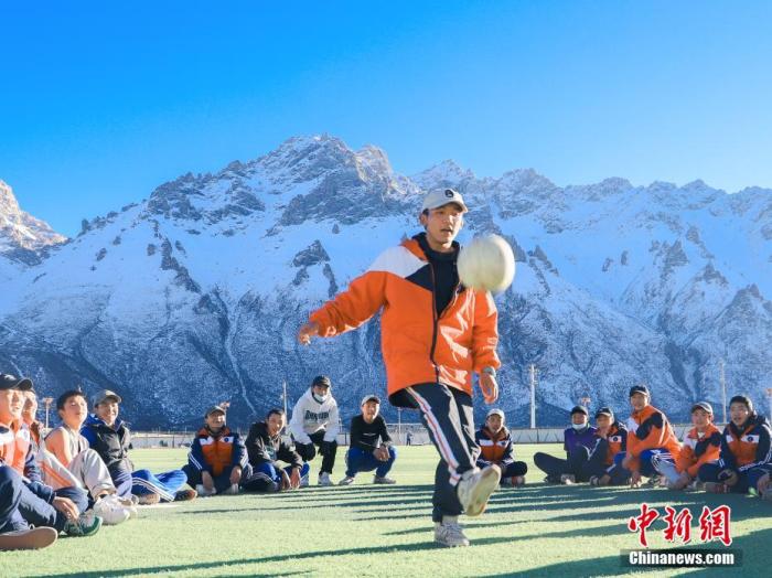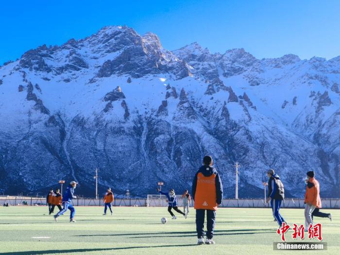 圖為11月25日,西藏那曲市嘉黎縣中學(xué)學(xué)生們在“雪山下的夢幻足球場”上進(jìn)行足球訓(xùn)練。 中新社記者 貢嘎來松 攝