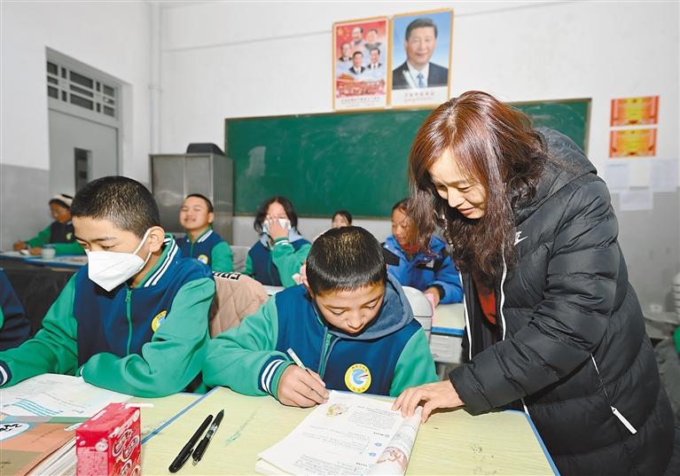 西格辦中學(xué)女教師給學(xué)生輔導(dǎo)功課。 記者 王敏 攝