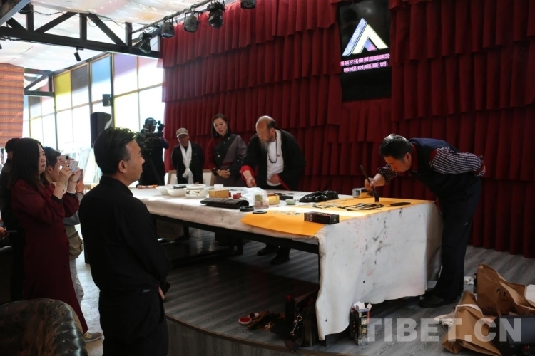 中國西藏網(wǎng)訊 “我想求幅字”“老師剛給我寫的‘寧靜致遠(yuǎn)’我要掛在辦公室,常常欣賞”“篆書書法也太有意思,真是長知識(shí)了”……5月16日,西藏榜書家協(xié)會(huì)的書法家們受邀走進(jìn)西藏文化旅游創(chuàng)意園區(qū)創(chuàng)業(yè)創(chuàng)新基地(以下簡稱:雙創(chuàng)基地),為這里的入駐企業(yè)主們獻(xiàn)書藝墨寶,和他們交流探討中華傳統(tǒng)文化。