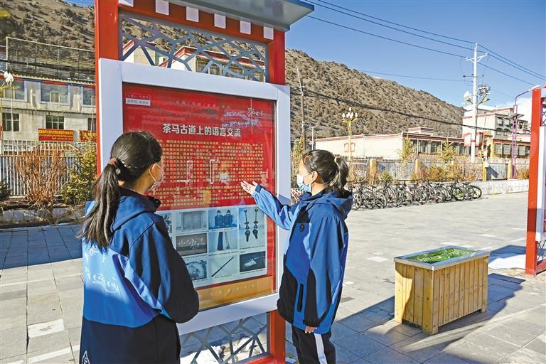 那曲市嘉黎縣中學民族團結(jié)長廊解說員(右)向同學講解茶馬古道上的民族團結(jié)故事。記者 薛瑩 益西加措 攝