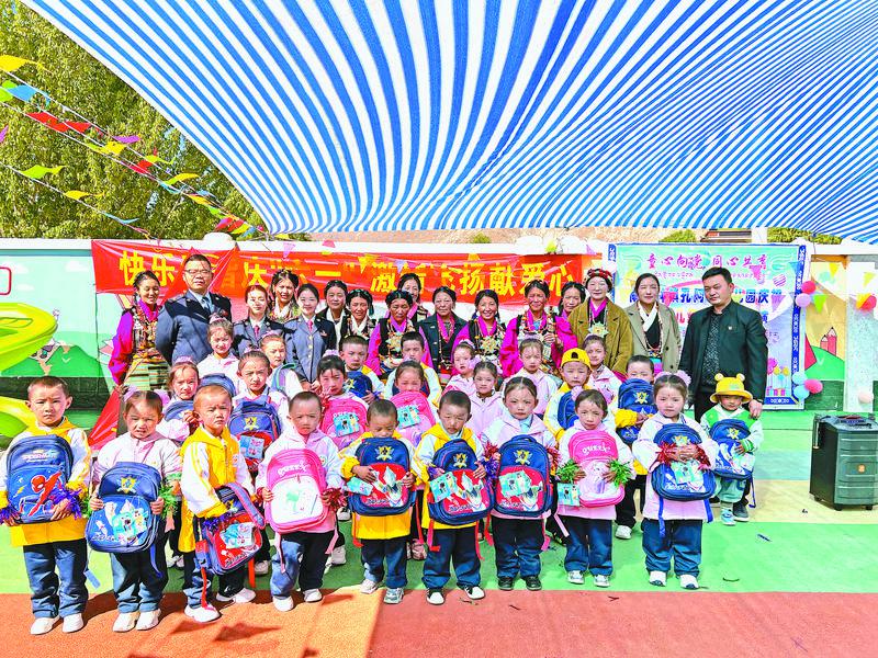圖為南木林縣稅務(wù)局工作人員與孔阿村幼兒園師生合影。南木林縣稅務(wù)局 提供