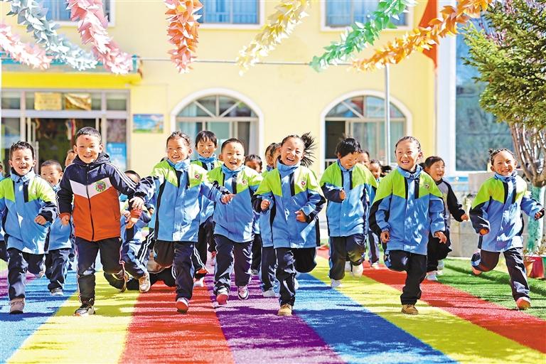山南市瓊結(jié)縣雙語(yǔ)幼兒園兒童在園內(nèi)嬉戲。