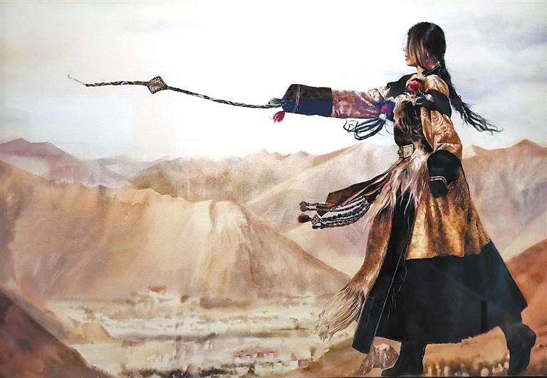 中國(guó)畫作品《幸福西藏》運(yùn)用工筆重彩的繪畫藝術(shù)表現(xiàn)形式,描繪了布達(dá)拉宮廣場(chǎng)上民族和睦的美好生活圖景。畫面中,湛藍(lán)天空下,藏族群眾與遠(yuǎn)道而來(lái)的各地游客們相聚雪域高原,燦爛的笑容映照出新時(shí)代西藏人民的美好生活,也反映出西藏自然風(fēng)光、人文風(fēng)情對(duì)各地游客的極大吸引力。從青年旅行者們或騎著單車,或舉起相機(jī)認(rèn)真拍照的表情,能深刻感受到他們對(duì)美麗西藏的向往。同時(shí),繪畫作品反映出近年來(lái)西藏旅游事業(yè)的蓬勃發(fā)展以及各族兒女團(tuán)結(jié)互助、攜手進(jìn)步的新時(shí)代美好生活景象。水彩·粉畫《颯·薩》運(yùn)用人物特寫的藝術(shù)創(chuàng)作手法,展現(xiàn)出一位西藏姑娘甩出烏爾朵的颯爽姿態(tài);油畫《藏歷新年薩迦禳祈?!芬悦骺鞜崃业纳屎嫱谐霎?dāng)?shù)孛癖娺M(jìn)行藏歷新年祈?;顒?dòng)的歡樂(lè)場(chǎng)景;油畫《中國(guó)玉麥》以紀(jì)實(shí)敘事的創(chuàng)作方式,描繪了隆子縣玉麥鄉(xiāng)卓嘎、央宗姐妹放牧守邊的故事,畫面中她們專注地懸掛國(guó)旗的樸實(shí)舉動(dòng),傳遞出高原姊妹對(duì)祖國(guó)的深愛(ài)之情。