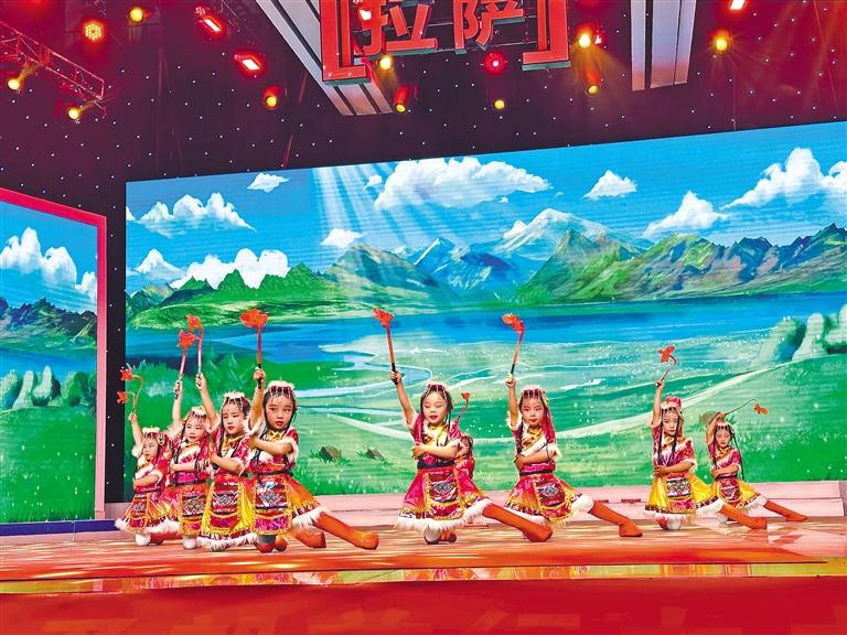 圖為拉薩市實(shí)驗(yàn)幼兒園東城分園的小朋友在表演舞蹈《歡樂的熱巴》。