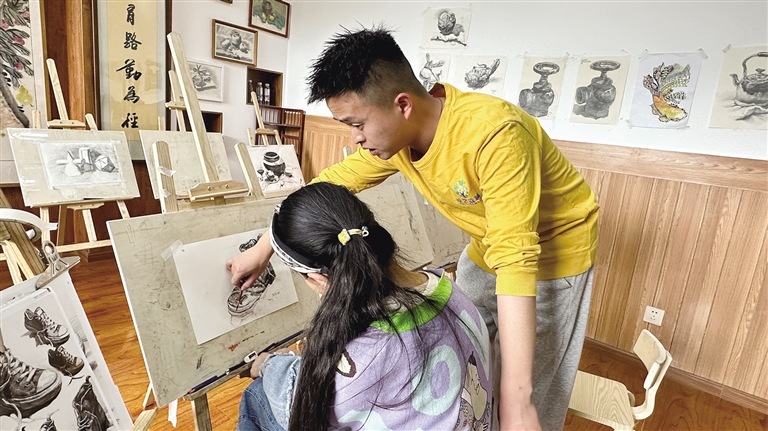 “‘西瓜老師’,這個(gè)面包是我特意帶給你的,你餓的時(shí)候一定吃?!薄啊鞴侠蠋煛憧次医裉飚嫷迷趺礃??有沒有進(jìn)步?”“‘西瓜老師’,這個(gè)地方我不會(huì)畫,你能不能教教我?”……課余時(shí)間里,陳寶佳經(jīng)常和孩子們一起玩耍,慢慢就成為了孩子們的好朋友。陳寶佳說:“雖然平時(shí)會(huì)和他們?cè)谝黄鹫f說笑笑,但是上課的時(shí)候我還是比較嚴(yán)厲的。我主要帶素描課,要引導(dǎo)孩子們打好繪畫基礎(chǔ)、練好基本功,今后他們才能在繪畫方面有更多的發(fā)展??吹胶⒆觽儺嫯嬘羞M(jìn)步的時(shí)候,我會(huì)覺得很幸福。”