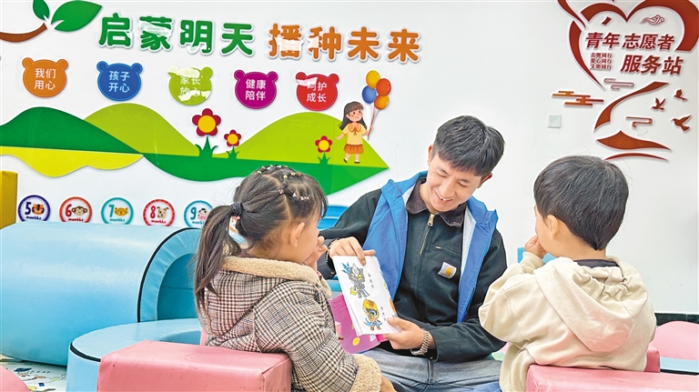 圖為昌嘎村日間照料中心的科技專(zhuān)干班旦次仁在陪小朋友玩耍。倫珠澤仁 記者 白瑪澤旺 攝