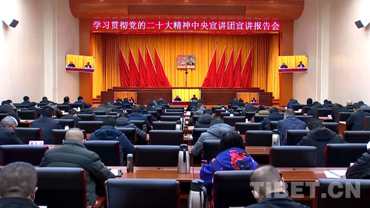 圖為在阿里地區(qū)地委會堂各單位代表集中收看黨的二十大精神中央宣講團(tuán)報告會 來源:中國西藏網(wǎng)