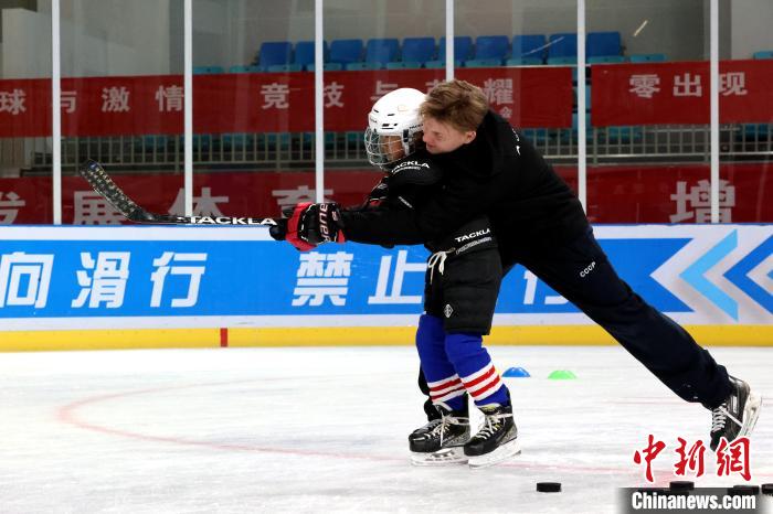 圖為外籍教練手把手教學(xué)冰球射門。薛蒂 攝