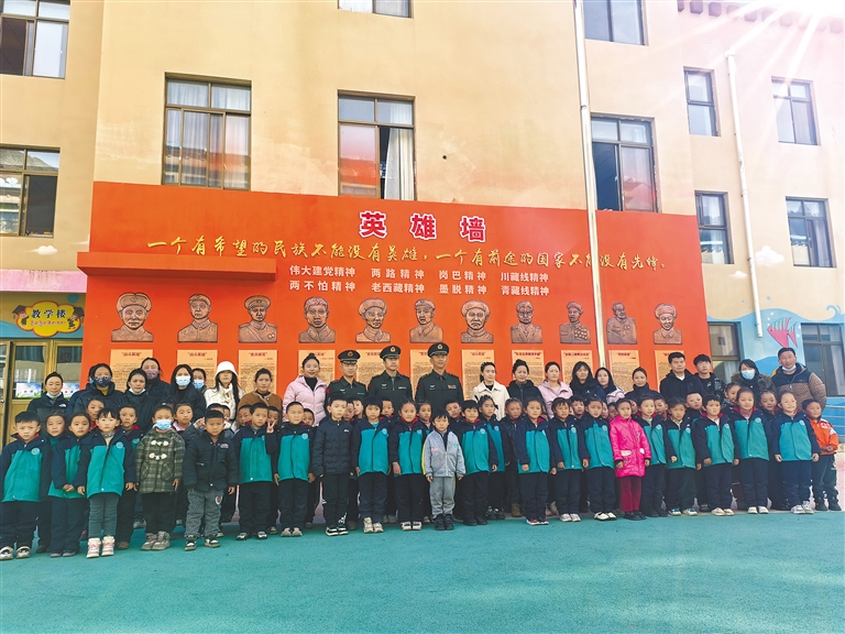 圖為部隊官兵與城關(guān)區(qū)第四幼兒園師生在英雄墻前合影。通訊員 王冠文 王鋒 記者 武沛濤 攝