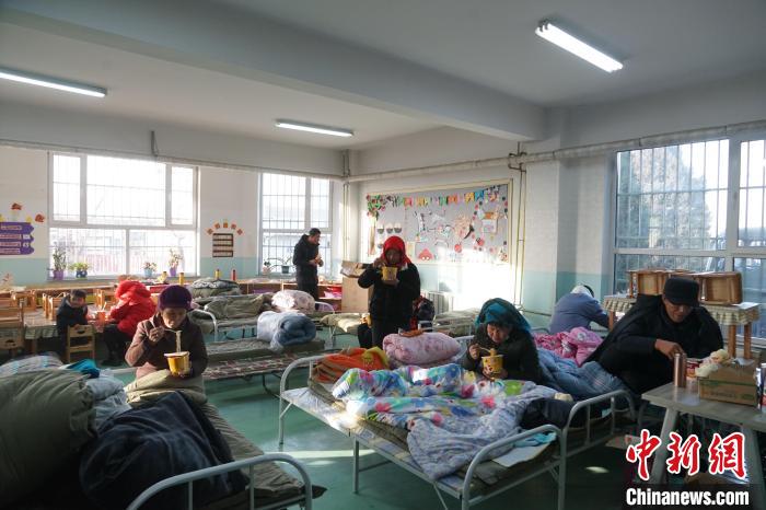 12月20日,青海省海東市民和縣中川鄉(xiāng)美一小學安置點內(nèi)民眾正在就餐。馬銘言 攝