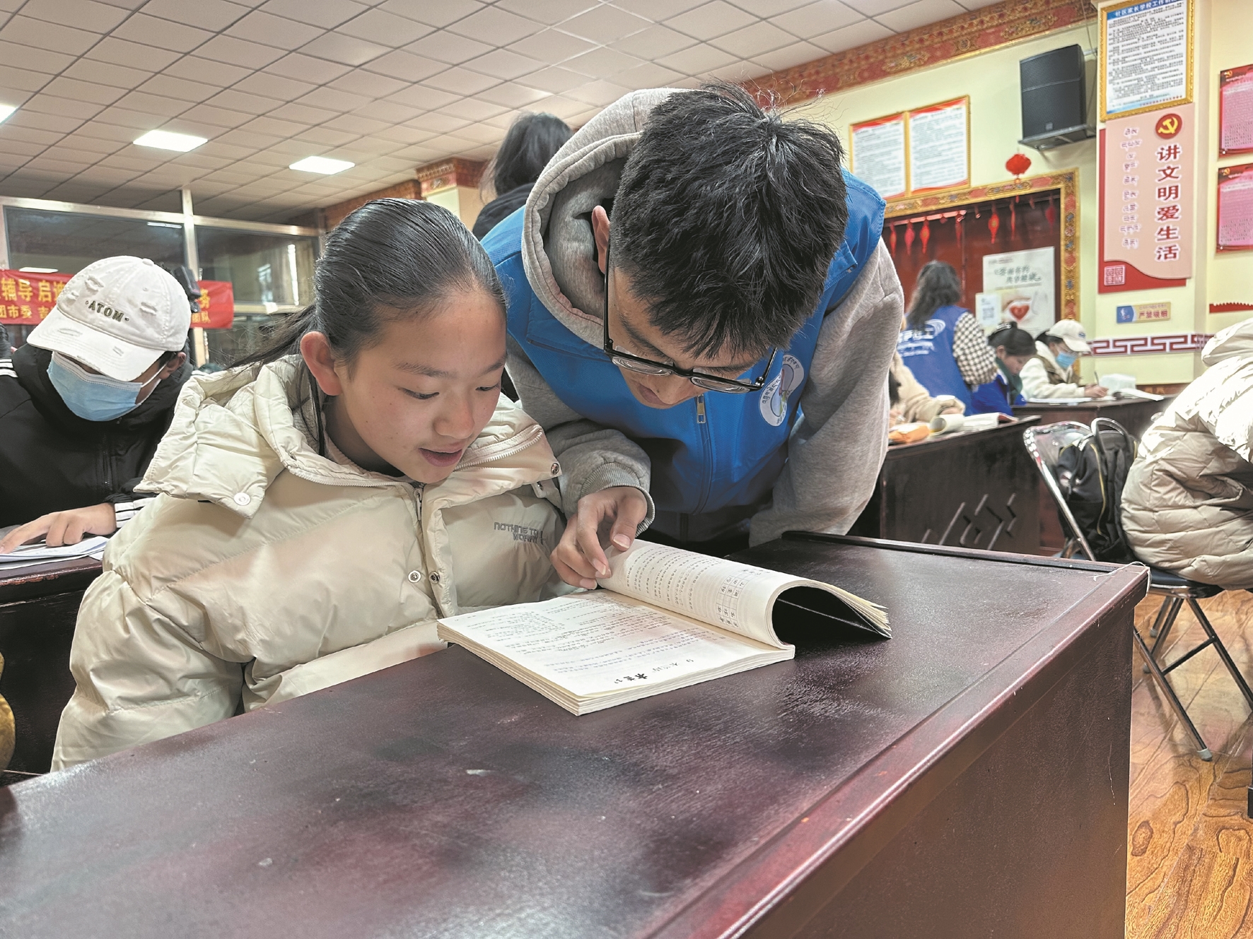 圖為大學(xué)生志愿者在為吉崩崗街道的孩子輔導(dǎo)功課。 拉薩融媒記者 旦增拉珍攝