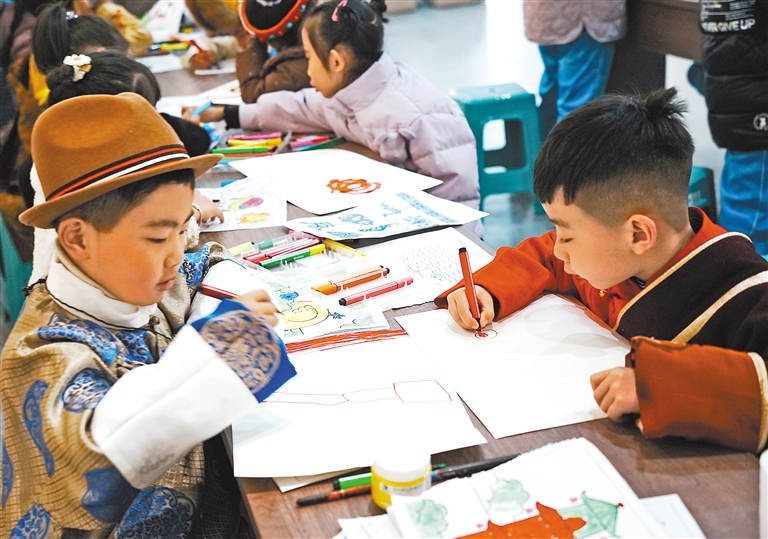 圖為孩子們?cè)谡桂^內(nèi)繪畫(huà)。記者 袁海霞 鄭璐 通訊員 普珍 攝