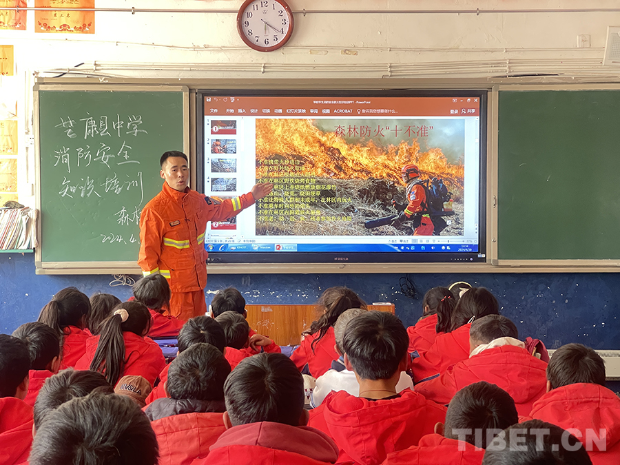在芒康縣中學(xué)授課現(xiàn)場,芒康縣森林消防分隊(duì)負(fù)責(zé)人夏能向全校師生講解森林防火的重要意義、火災(zāi)的起因、相關(guān)法律法規(guī)和常用防火知識等,教育引導(dǎo)同學(xué)們樹立森林防火意識,做到不帶火種進(jìn)山,發(fā)現(xiàn)火情及時(shí)報(bào)警。