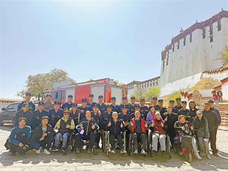 “圓夢”之旅結束后,殘障游客與消防指戰(zhàn)員在布達拉宮腳下合影。