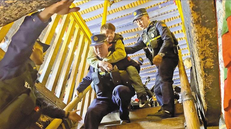 消防指戰(zhàn)員們用擔架幫助殘障游客“圓夢”。