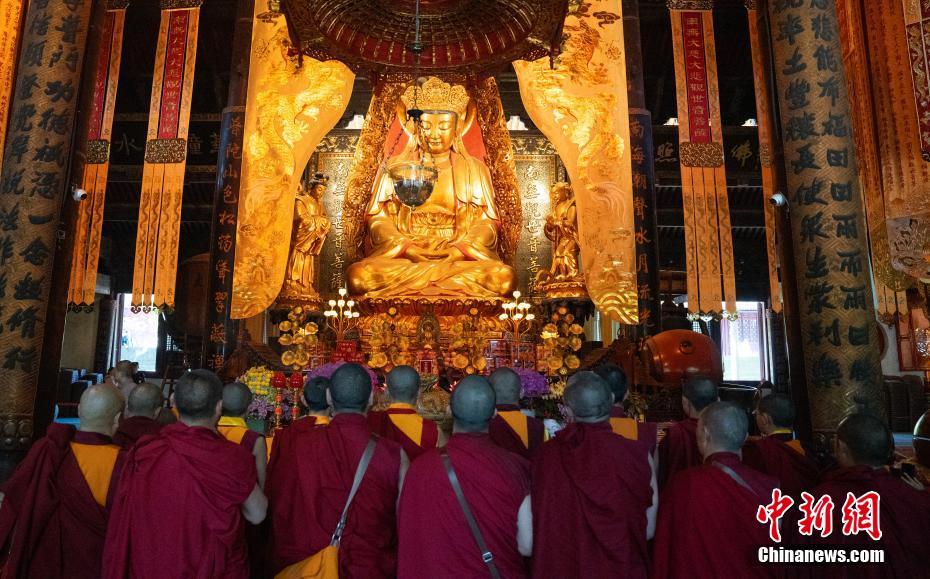 5月16日至18日,西藏少年活佛參學(xué)團(tuán)赴浙江參觀學(xué)習(xí),感受江南水鄉(xiāng)綿延的歷史人文底蘊(yùn)。圖為5月16日,西藏少年活佛參學(xué)團(tuán)在普陀山普濟(jì)禪寺誦經(jīng)禮佛。