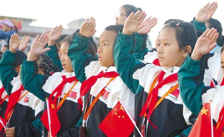孩子們?cè)谔彀查T(mén)廣場(chǎng)觀看升旗儀式。中國(guó)兒童中心供圖