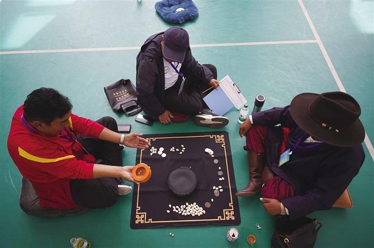 當(dāng)日,“吉韌”“秀茲”等項目一同開賽。 “吉韌”也叫藏式克郎球,是藏族的一種彈指運動。比賽在一張邊長約1米的正方形木桌球臺上進(jìn)行,球臺四角有4個小洞,黑、白兩種扁圓形球子各9個,另有1個紅色球子放置在球臺中心,1個白色母球供雙方彈擊球子所用。
