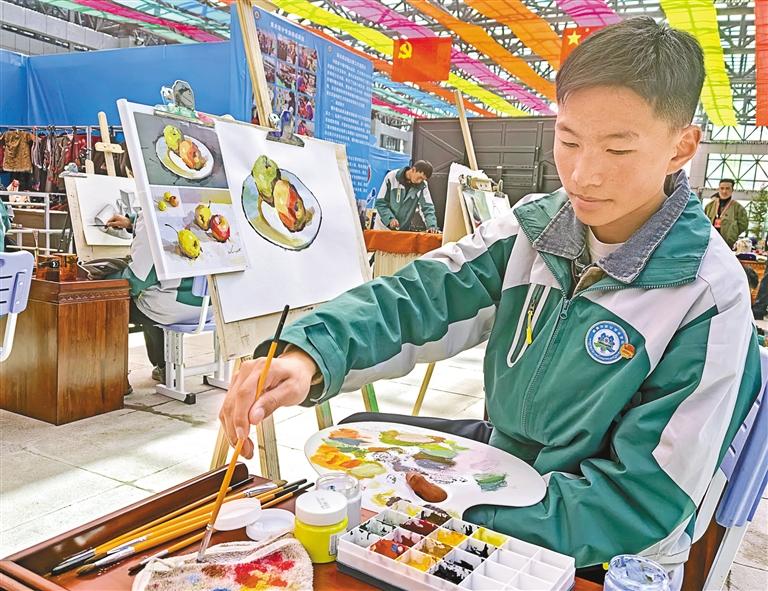 圖為那曲市職業(yè)技術(shù)學(xué)校的學(xué)生在進(jìn)行繪畫創(chuàng)作。記者 萬靖 攝