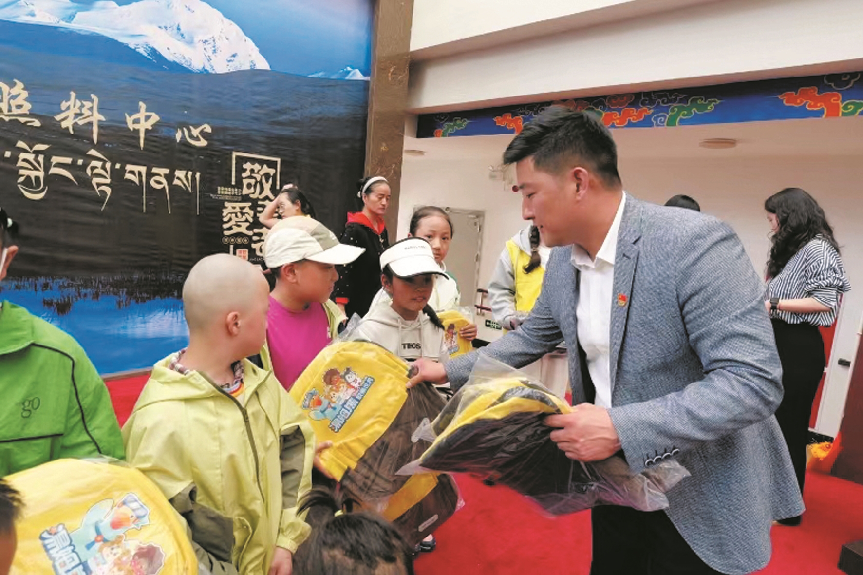 圖為自治區(qū)互聯(lián)網(wǎng)協(xié)會(huì)相關(guān)負(fù)責(zé)人為困難兒童發(fā)放學(xué)習(xí)用品。 拉薩融媒記者 齊永昌攝