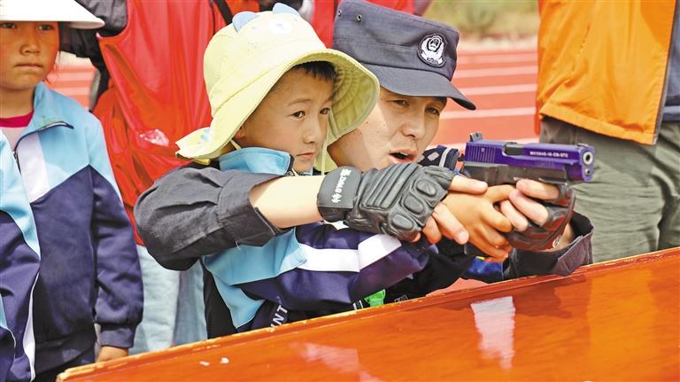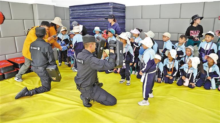 圖為特警向幼兒園小朋友展示警用裝備。記者 武沛濤 攝