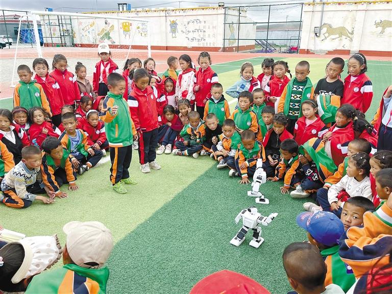 圖為阿里地區(qū)改則縣麻米鄉(xiāng)小學學生在觀看機器人表演。 王飛標 記者 潘璐 攝