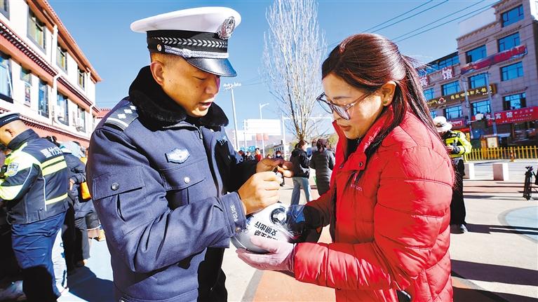 圖為民(輔)警向群眾免費(fèi)發(fā)放頭盔。記者 格桑倫珠 通訊員 果珍 攝