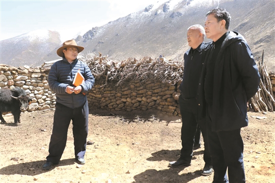 4月14日至15日,區(qū)黨委常委、拉薩市委書記白瑪旺堆深入林周縣開展脫貧攻堅(jiān)調(diào)研督戰(zhàn)工作。圖為白瑪旺堆來(lái)到林周縣旁多鄉(xiāng)達(dá)龍村,向村里工作人員了解村民脫貧增收、牦牛養(yǎng)殖等情況。