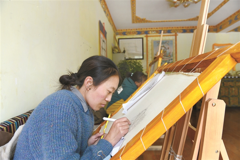 西藏雪堆白傳統(tǒng)手工藝術(shù)學(xué)校創(chuàng)辦至今已有十個(gè)年頭。作為學(xué)校目前最成熟、最系統(tǒng)化的專(zhuān)業(yè),唐卡繪畫(huà)專(zhuān)業(yè)吸引了許多前來(lái)學(xué)藝的農(nóng)牧民子女和社會(huì)人士。