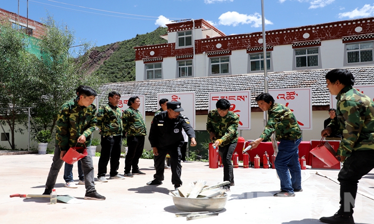 中國(guó)西藏網(wǎng)訊 “拔下保險(xiǎn)銷,讓噴嘴對(duì)準(zhǔn)火焰根部……”46歲的尼瑪一邊講解一邊演示滅火器使用方法和注意事項(xiàng),身邊幾位穿著迷彩服的學(xué)員正認(rèn)真觀察并模仿著。
