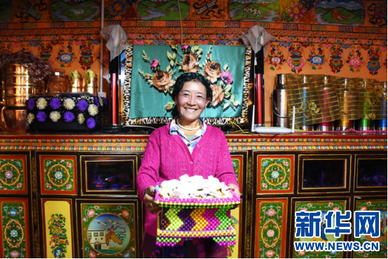 崗巴縣群眾端著糖果盒迎接遠到的客人(9月15日攝)。新華網(wǎng) 張宸 攝