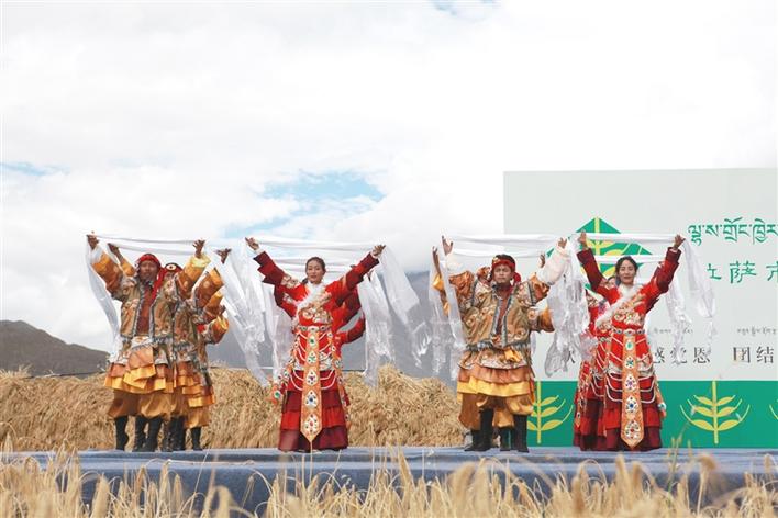 春種一粒粟,秋收萬顆子,今年又是一個(gè)豐收年!在這金秋颯爽、碩果累累的季節(jié)里,9月22日上午,拉薩市第三屆中國(guó)農(nóng)民豐收節(jié)在堆龍德慶區(qū)隆重舉行。本次豐收節(jié)慶?;顒?dòng)吸引了大批農(nóng)牧民朋友匯聚于此,使得活動(dòng)開幕式現(xiàn)場(chǎng)熱鬧非凡,在一片豐收的青稞田里,人們載歌載舞,分享豐收的喜悅。文/圖 記者 趙夢(mèng)茹
