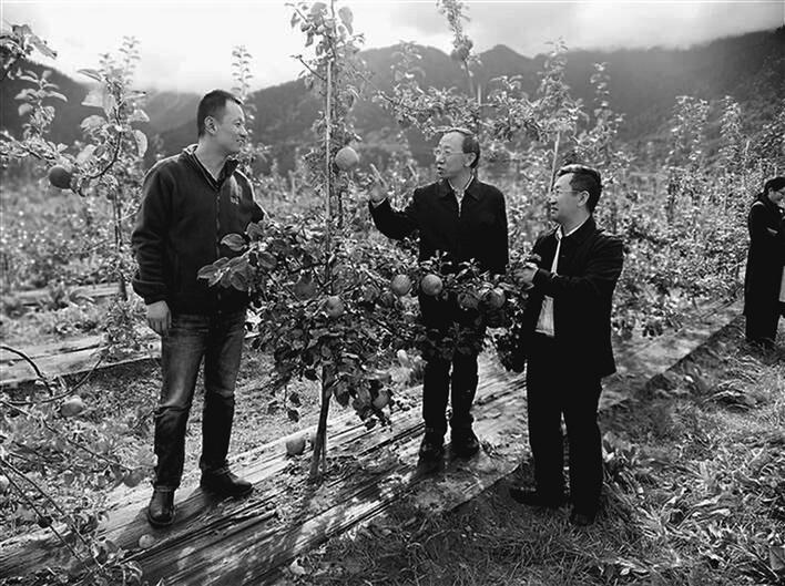 國家蘋果產(chǎn)業(yè)技術(shù)體系首席科學(xué)家霍學(xué)喜(中)在米林縣羌納蘋果示范基地現(xiàn)場開展技術(shù)指導(dǎo)。西藏日報(bào)記者 李梅英 攝