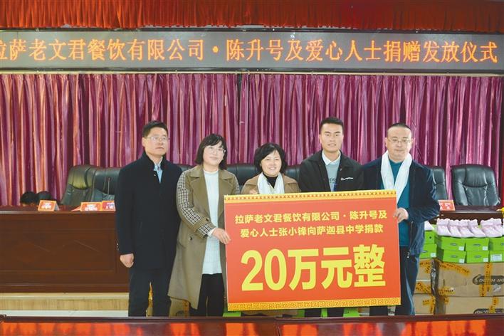 10月 28日,拉薩老文君餐飲有限公司·陳升號(hào)及相關(guān)愛(ài)心人士向薩迦縣中學(xué)捐贈(zèng)405雙價(jià)值68445元的運(yùn)動(dòng)鞋,并達(dá)成20萬(wàn)元捐款意向,用于薩迦中學(xué)教育發(fā)展。