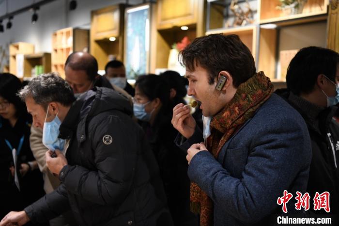 圖為中外嘉賓觀摩隴南市油橄欖產(chǎn)業(yè)時,品嘗加工后的油橄欖果?!¢Z姣 攝