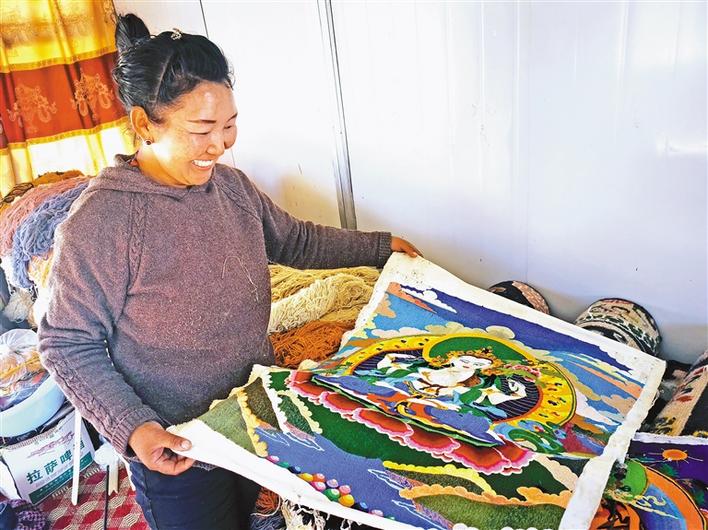 圖為西藏日喀則市易地扶貧搬遷點(diǎn)群眾展示自己的藏繡作品。記者 王莉 通訊員 德吉央宗 攝